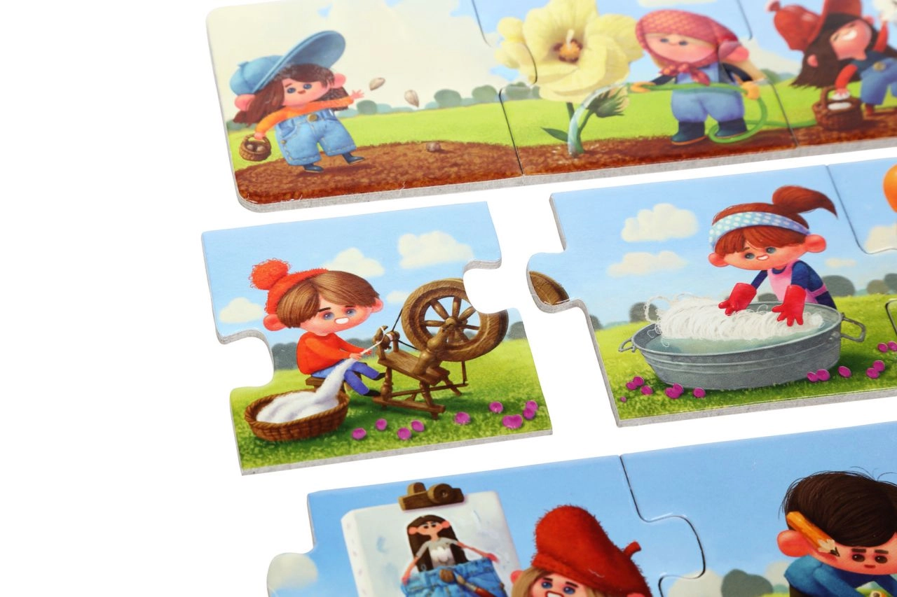 Zgodbeno sestavljanko Puzzlika Izdelava kavbojk otrokom od 2 let ponuja zabavno učenje skozi sestavljanje zgodbe – od žetve bombaža do končnih kavbojk. Veliki in trdni kosi so idealni za male roke, jasne ilustracije pa pomagajo razumeti zaporedje posameznih korakov.