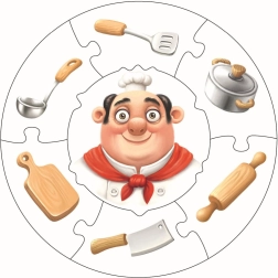 Ilustracija kuharja z orodjem (kuhalnica, lonec, valjar) pomaga razvijati logiko in spoznavanje vsakdanjih opravil.