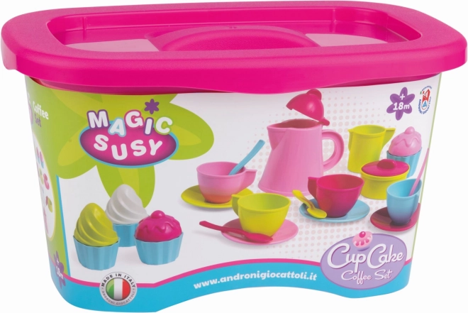 Stilni kavni set znamke Androni spremeni vsako otroško kuhinjico v majhno kavarno. Set vsebuje vse za igro barista – od vrčka in skodelic do prikupnih cupcakov – in je izdelan iz kakovostnih, trpežnih in prožnih plastike v Italiji. Zahvaljujoč 24 delom, praktičnemu shranjevalnemu boxu s pokrovom in varni zasnovi je idealen za otroke od 18 mesecev ter tudi za vrtce.
