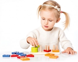 Naanjanje delčkov na zatiče krepi koordinacijo oko–roka, natančnost prijema in zbranost – ključne veščine za predšolsko obdobje.