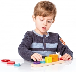 Natikanje oblik na količke spodbuja koordinacijo oko–roka, potrpežljivost in osredotočenost; idealna dejavnost za otroke od 18 mesecev.