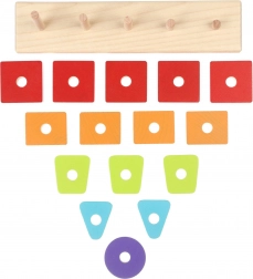 Z različnimi geometrijskimi kosi in ponavljajočimi se barvami si otroci zlahka osvojijo razvrščanje, uparjanje in pravilno namestitev na količke podstavka.