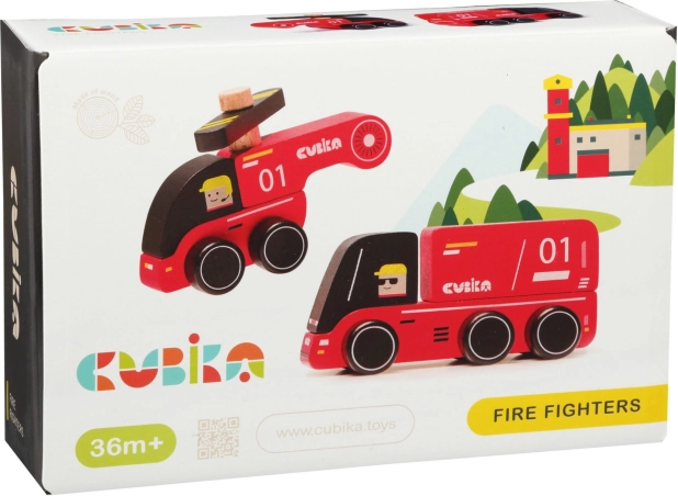 Leseni komplet CUBIKA gasilci vsebuje en gasilski avto in en helikopter iz kakovostnega javorja in bukve. Zahvaljujoč zaobljenim robovom in varnim barvam na vodni osnovi je idealen za otroke od 3 let. Certifikata TÜV in evropski standard EN 71 zagotavljata visoko varnost. Izdelano v Evropi. Dolžina avta 12 cm, helikopterja 10 cm.