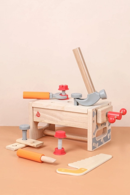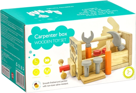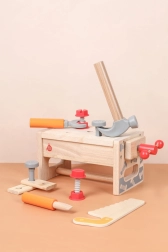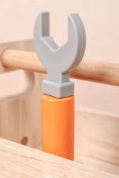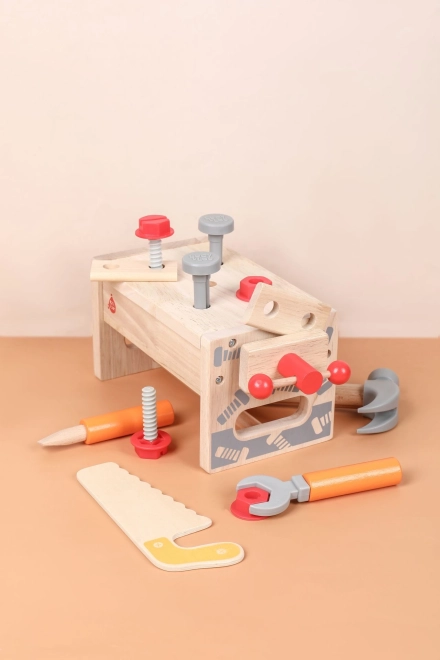 Del kompleta je raznoliko otroško orodje: kladivo, žagica, izvijač, ključ, vijaki in matice, primež ter gladki leseni delčki z luknjami. Vse ima svoje mesto, zato se otroci učijo reda in osnovnih tehnik dela s pritrdilnim materialom. Igra spodbuja ustvarjalno gradnjo, koordinacijo oko–roka in potrpežljivost.