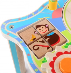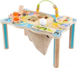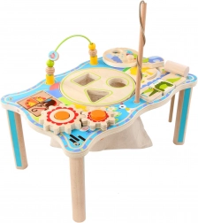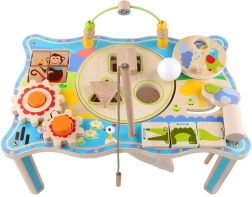 Lesena mizica z džungelskimi motivi združuje zabavo in učenje ter podpira fino motoriko, koordinacijo oko–roka in logično mišljenje. Otroci lahko vrtijo zobnike, premikajo kroglice po stezi, vadijo moč in zbranost s kladivcem ter urijo prepoznavanje oblik z vstavljanko. Na sredini je lanena vrečka za ulovljene ribice in igralne dele, ki ohranja igralno površino urejeno.