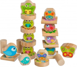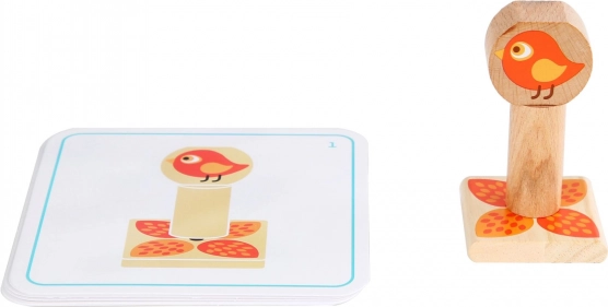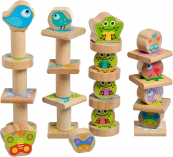 Bloki so izdelani iz trpežnega lesa, imajo gladke, zaobljene robove in prijetno ležijo v roki. Igra spodbuja zbranost, logično razmišljanje in razlikovanje oblik, pri čemer otroci vadijo potrpežljivost in natančnost pri gradnji stabilnih stolpov in vzorcev.