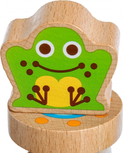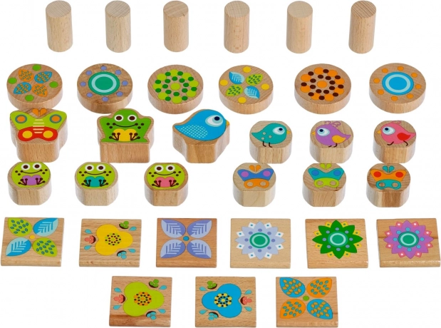 - 33 lesenih delov z barvitimi ilustracijami žabic, ptičkov in metuljev.