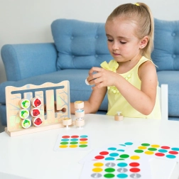 Priloženih je 6 dvostranskih kart z barvnimi vzorci. Otroci po njih nameščajo čepke na pravilna mesta in razvijajo logično razmišljanje.