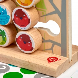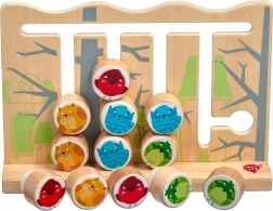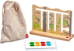 Ta kakovostna lesena igra ponuja intuitivno premikanje barvnih čepkov z živalmi po izrezkanih kanalčkih. Zahvaljujoč 6 dvostranskim kartam s predlogami otroci urijo koordinacijo oko–roka, potrpežljivost in koncentracijo. Po koncu igre je mogoče vse koščke preprosto pospraviti v laneno vrečko.