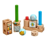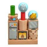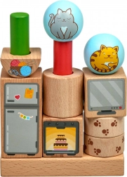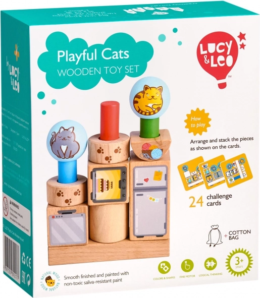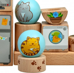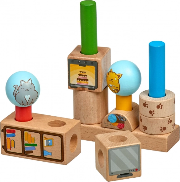 Vzdržljivi leseni liki z nežno brušeno površino ter ilustriranimi motivi mačk in predmetov. Idealno za majhne otroške roke.