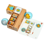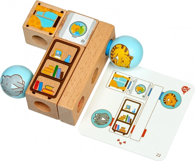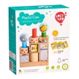 Lesena sestavljanka Igrive mačke prinaša učenje skozi igro z zlaganjem barvitih likov na osnovo z zatiči. S 24 karticami z nalogami otroci preizkušajo različne razporeditve ter se učijo zaznavati prostor, oblike in barve. Kakovostna lesena izdelava in varne barve zagotavljajo dolgo življenjsko dobo in prijetno igro.
