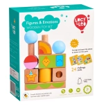 - Osnova s količki, barvne lesene oblike z motivi čustev, 24 predlog (kartic), lanen vreček