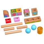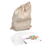 Del paketa je 24 izzivov/predlog, ki postopoma povečujejo zahtevnost. Z lanenim vrečkom se vsi deli enostavno pospravijo, zato je igrača idealna tudi za na pot. Varni materiali in gladki robovi so prilagojeni otroškim rokam.