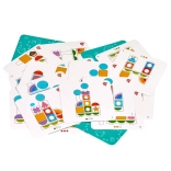 Komplet vsebuje 24 kartic z različno zahtevnostjo. Otroci urijo natančnost, načrtovanje korakov ter vizualno razločevanje oblik in barv.