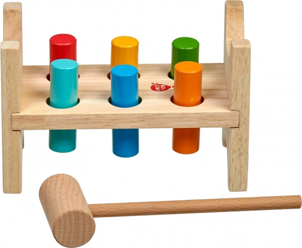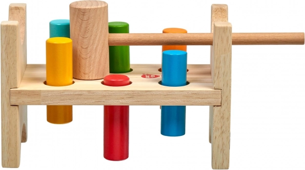 Šest barvnih zatičev in leseno kladivce učita otroke natančnega prijema, moči udarca in koordinacije oko–roka.