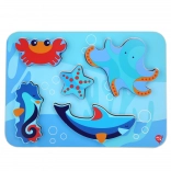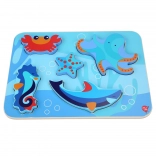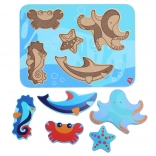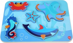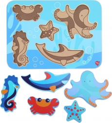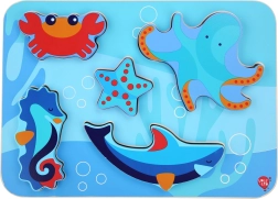 Otroške lesene puzzle z motivom morskih živali so zasnovane za učenje skozi igro. Šest barvitih kosov – na primer hobotnica, morska zvezda in morski konjiček – natančno sodi v izrezane oblike na trdni podlagi z oceanskim motivom. Kosi so dovolj veliki za dober oprijem in zaradi svoje debeline lahko samostojno stojijo.