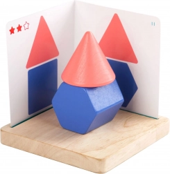 Otroci po predlogi razporejajo valje, stožce, kocke in druge like, s čimer krepijo logično razmišljanje in vizualno zaznavanje.