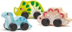 Komplet vsebuje tri lesene dinozavre s koleščki za enostavno premikanje, idealno za malčke.