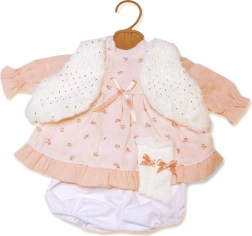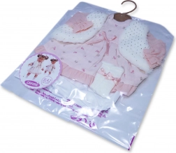 Privoščite svoji punčki novo garderobo: rožnata oblekica z nežnim vzorcem, ki jo dopolnjuje mehka bela vestica in udobne hlačke. Set je zasnovan za punčke velikosti 42 cm in navduši z usklajenimi detajli ter preprostim oblačenjem.