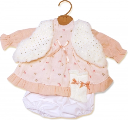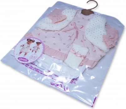 Stilski 4-delni komplet oblačil za punčko 42 cm znamke LLORENS razveseli z nežno rožnato oblekico, mehko vestico in hlačkami; priložen je tudi obešalnik. Izdelano v Španiji, idealno za vsakodnevno igro in posebne trenutke. Primerno od 3 let.