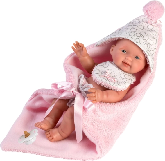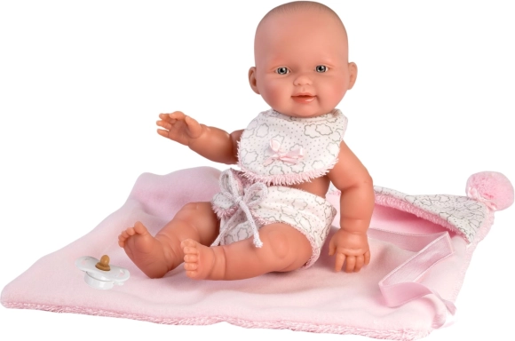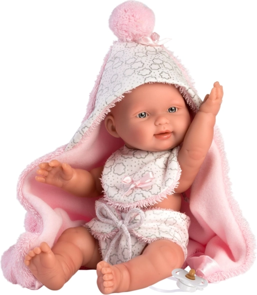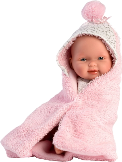 Ta dvodelni komplet je posebej zasnovan za dojenčkasto punčko New Born velikosti 26 cm. Vključuje obojestransko odejico s kapuco, ki punčko ščiti in ji daje videz pravega dojenčka.