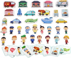Bogata zbirka magnetnih delov in dvostranskih kart spodbuja otroke k pravilnemu ujemanju ter svobodnemu ustvarjanju pri spoznavanju različnih poklicev.