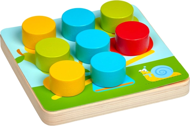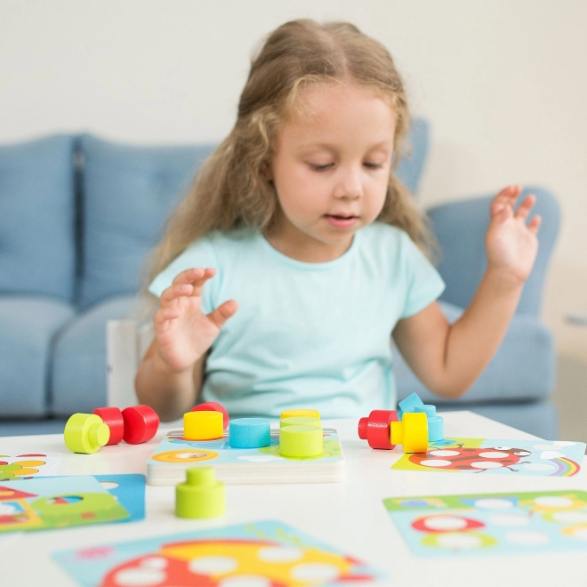 Veliki leseni zatiči se zlahka primejo in vstavljajo v odprtine, kar podpira koordinacijo oko–roka in učenje barv skozi naravno igro.
