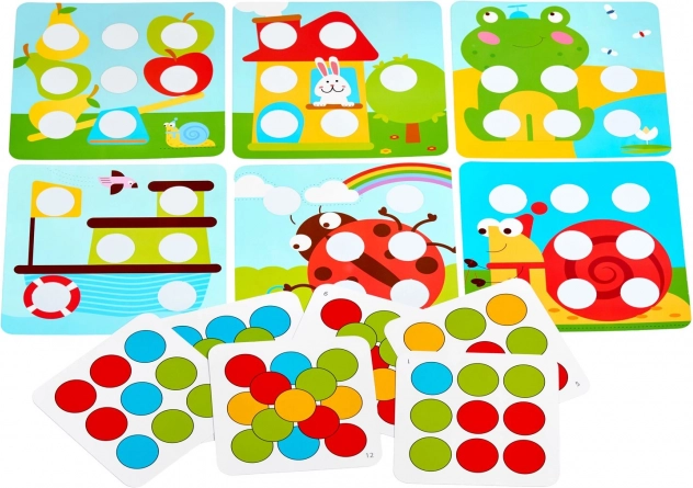 Vsebuje perforirane slike in barvne šablone za sestavljanje na deski – otroci lahko ustvarjajo po vzoru ali po lastni domišljiji.