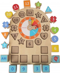 Lesena učna plošča LUCY & LEO združuje sestavljanko in uro. Otroci razporejajo barvne oblike s številkami okoli številčnice, vrtijo kazalce in se tako učijo analogni in digitalni čas. S kockami AM/PM zlahka razumejo razliko med dopoldnevom in popoldnevom ter vadijo angleške oznake časa.