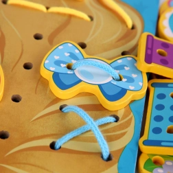 Set vsebuje 31 lesenih delcev in 4 barvne vezalke, zato ponuja veliko kombinacij in ponovno igranje. Zaradi kakovostnega lesa in gladke obdelave je igrača varna in prijetna na dotik. Odlično se obnese za igro doma in kot montessori navdih v vrtcih.