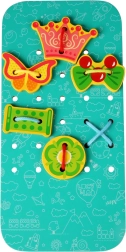 Leseni prepletalni set Princesa prinaša igrivo učenje in veliko domiselne zabave. Na veliki podlagi s princeso si lahko otroci ustvarjajo lastne pričeske in jih krasijo s kronami, pentljami ali metuljčki, ki jih s pomočjo vezalk pritrdijo v vnaprej pripravljene odprtine. Aktivnost spodbuja potrpežljivost, zbranost in razvoj fine motorike.