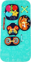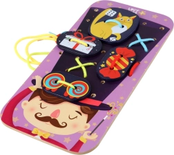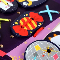 Ta zabavni nizalni in prepletalni set s čarovniško tematiko otroke vabi v svet domišljije. Na veliko podlago z glavo čarovnika in njegovim klobukom lahko z vezalkami pritrjujejo barvite dodatke – od zajčka in kovancev do skrivnostnih kart. Med igro otroci urijo koordinacijo oko–roka, potrpežljivost in ustvarjalnost.