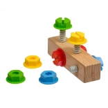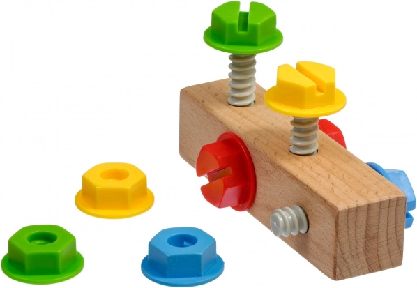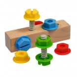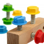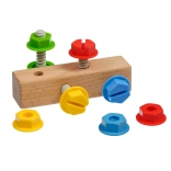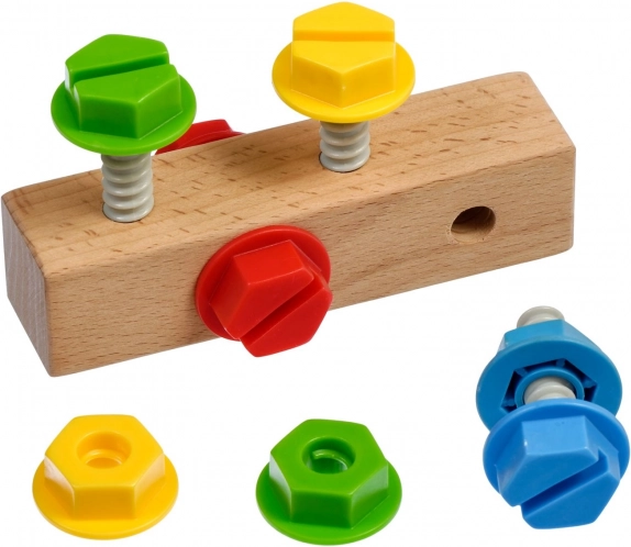 Igrača je idealna za predšolske otroke in podpira naravno učenje skozi igro. Zahvaljujoč intenzivnim barvam si otroci zlahka urijo barvno ujemanje in razvrščanje, medtem ko vijakanje v leseni blok razvija tehnično razmišljanje in potrpežljivost.