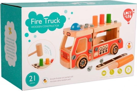 Sestavite si lastno leseno gasilsko vozilo in razvijajte spretnosti z Montessori konstrukcijskim setom LUCY & LEO. Otroci bodo uživali v zabijanju zatičev s kladivcem, vijačenju in sestavljanju iz 21 delov, pri čemer urijo fino motoriko, koordinacijo oko–roka, razlikovanje barv in oblik ter potrpežljivost. Varne netoksične barve in trpežna lesena izvedba zagotavljajo dolgotrajno zabavo.