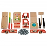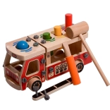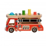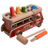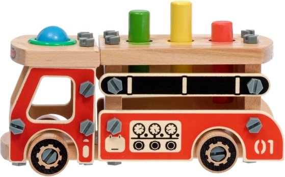 Ta ustvarjalni set združuje gradbeni komplet in zabijanko v enem. Otroci najprej sestavijo robustno leseno gasilsko vozilo, nato pa na njegovem kesonu uporabijo štiri odprtine za zabavno zabijanje barvnih elementov s kladivcem. Zahvaljujoč živim barvam in raznolikim oblikam igrača podpira naravno učenje in osredotočenost.