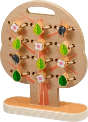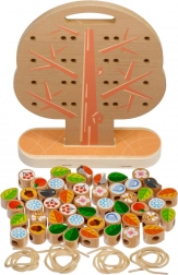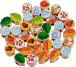Ta kakovosten leseni set prinaša otrokom zabavno prepletanje in vezanje na trdni drevesni plošči s stojalom. Del kompleta so barvni delčki (listi, cvetovi, jagode, želodi, sadje, snežinke, žuželke ipd.) in več vrvic za neskončne variacije. Po igri lahko delčke shranite v praktično laneno vrečko.