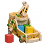 Pakiranje vsebuje 16 lesenih delov za sestavo žerjava, vijake, izvijač in 4 barvne kocke, ki predstavljajo tovor. Igrača je tudi Montessori pripomoček, ki otroku pomaga učinkovito razvijati različne spretnosti.