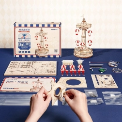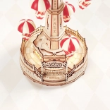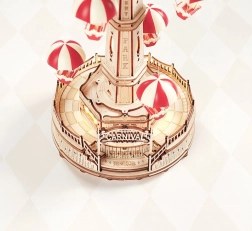 Ta dovršena 3D lesena sestavljanka je navdihnjena s klasičnim padalskim stolpom iz zabaviščnega parka. Šesterokotna osnova in stranska prosojna okna spuščajo toplo svetlobo, ki poudari edinstveno atmosfero. Vrtiljak poganja baterijski motor in osvetljujejo LED lučke, pri čemer tapno upravljanje omogoča ločeno vodenje gibanja in zvoka.