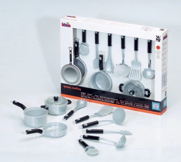 Set posode in kuhinjskih dodatkovVsebuje 9 kosov, vključno z: 2 loncema, ponvijo, rezalnikom za pico, zajemalko in več.Igrača je primerna za otroke od 3 let starosti..