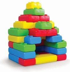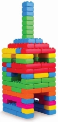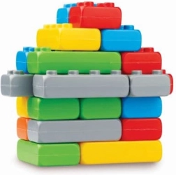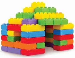 Set 33 velikih delov v treh oblikah omogoča otrokom gradnjo hišk, stolpov in sten. Lahke in enostavno združljive kocke spodbujajo domišljijo in samostojno igro.