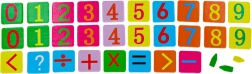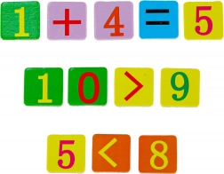 • Računanje skozi igro: magnetne številke in matematični znaki za enostavne vaje.