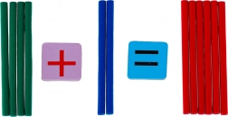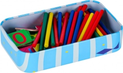 50 barvnih lesenih paličic, 4× kazalci za ure, 28 magnetnih kartic s številkami in matematičnimi znaki, kovinski etui