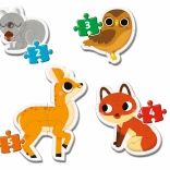 Odkrijte prve korake v sestavljanju s CLEMENTONI sestavljanko za otroke od 2. leta. Štiri samostojne sestavljanke z motivi gozdnih živalic (2, 3, 4 in 5 kosov) imajo velike in trdne koščke debeline približno 3 mm, ki so lahko oprijemljivi za male rokice. Igrača podpira fino motoriko, koordinacijo oko–roka in prostorsko orientacijo pri zabavnem učenju.