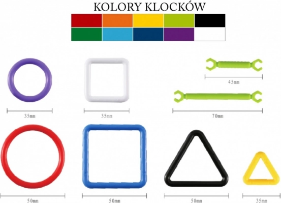 - Različne oblike – petničke, kolesca, kvadrati in trikotniki za gradnjo raznolikih objektov.