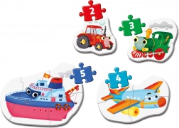 Odkrijte zabavni svet sestavljanja za najmlajše. Ta komplet vsebuje štiri samostojne sestavljanke z motivi različnih prevoznih sredstev in stopnjevano zahtevnostjo (2, 3, 4 in 5 koščkov), da si lahko otroci postopoma gradijo samozavest in veščine.