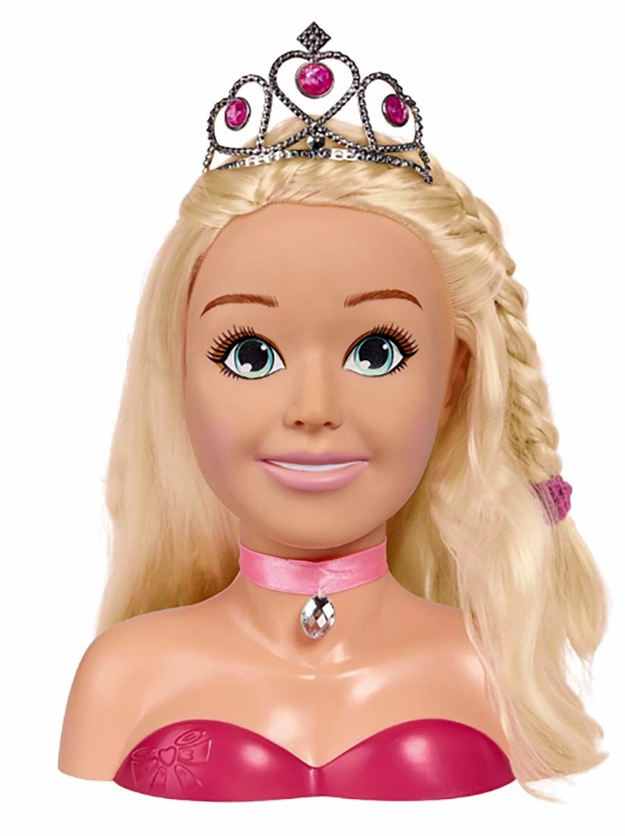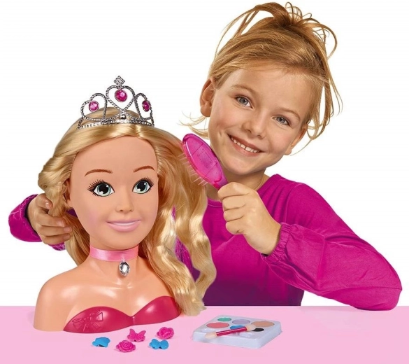 Ta očarljiva glava za oblikovanje z dolgimi blond lasmi in rožnatim trakom s kamenčkom je idealna za male frizerke in vizažistke. Zahvaljujoč naboru dodatkov – od srebrne krone do krtače, sponk in elastik pa vse do palete ličil – otroci zlahka ustvarijo pravljične pričeske in nežno ličenje.