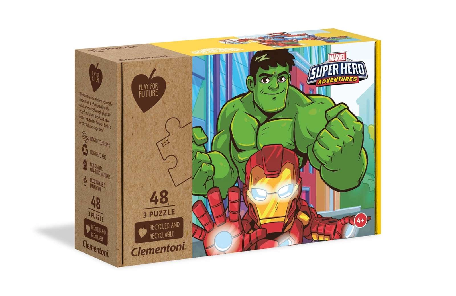 Otroški komplet treh sestavljank z motivi MARVEL Super Hero Adventures ponuja 3 slike po 48 koščkov v velikosti 32 × 22 cm. Izdelano iz 100 % recikliranih in reciklabilnih materialov, spodbuja opazovalne sposobnosti, logično razmišljanje in ročne spretnosti. Idealna zabava za otroke od 4 let naprej in za vso družino.