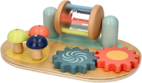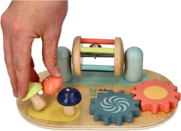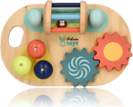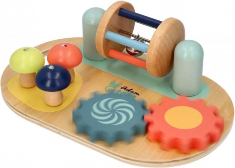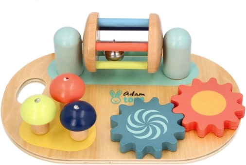 Lesena čutilna aktivna plošča znamke Adam Toys ponuja barvno čutno stimulacijo in razvoj fine motorike za najmlajše z vrtečimi zobniki in gobami za igro.