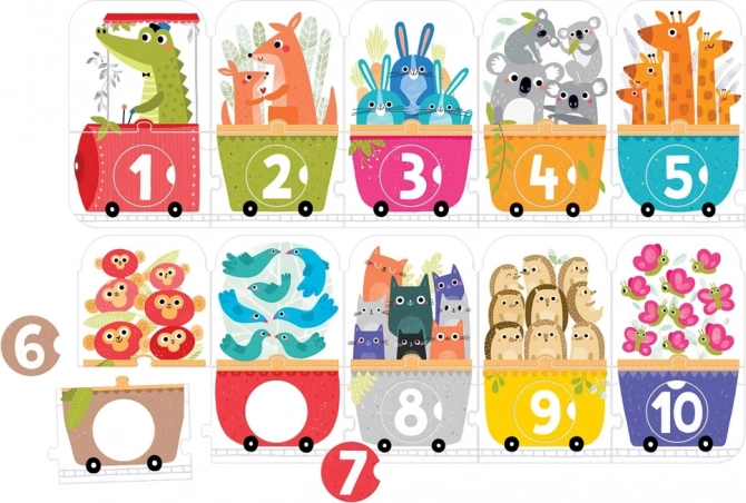 Odkrijte zabavno izobraževalno sestavljanko z motivom dolgega vlaka in njegovih potnikov. Set vsebuje 30 koščkov, od tega 10 izjemnih okroglih ploščkov s številkami za vstavljanje v pravilne odprtine. Idealno za otroke od 3 let – razvija fino motoriko, logiko in učenje štetja do 10 skozi kreativno igro z velikimi in trpežnimi deli.