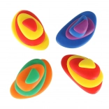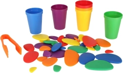Barvni kamenčki, lončki in kartice z nalogami vodijo otroke od preprostih do naprednejših aktivnosti: od razvrščanja po barvah do seštevanja in ustvarjanja vzorcev.